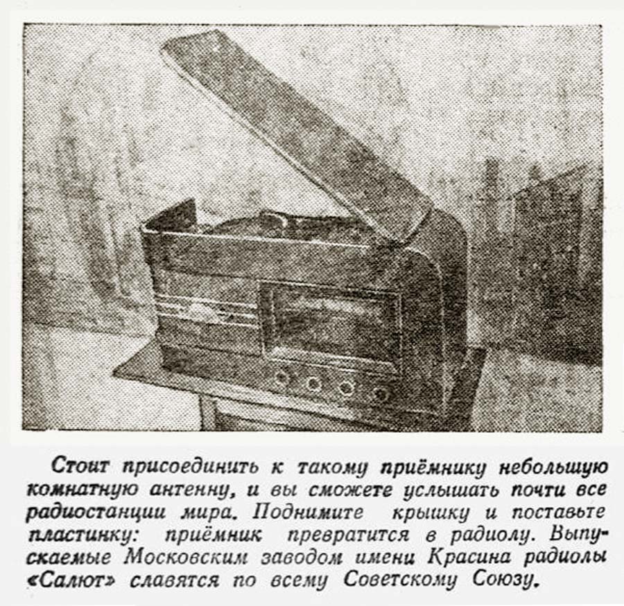 "Салют" выпускалась Московским заводом имени Красина с 1946 года. Радиола
