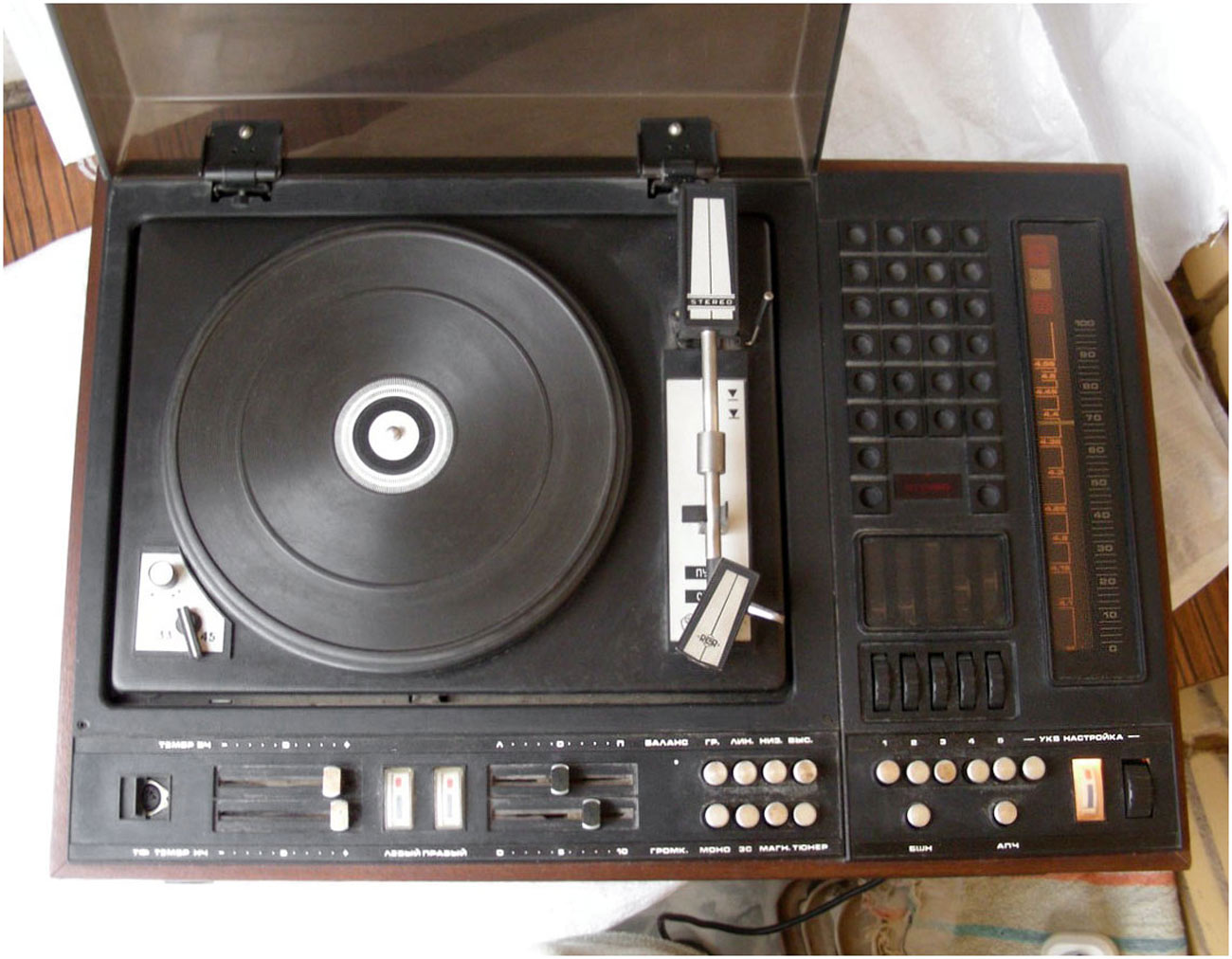 в диапазоне УКВ, воспроизводит моно и стереофонические грампластинки. К