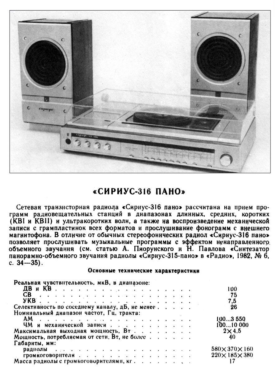 "Сириус-316-Пано" с 1985 года выпускалась Ижевским радиозаводом. Радиола