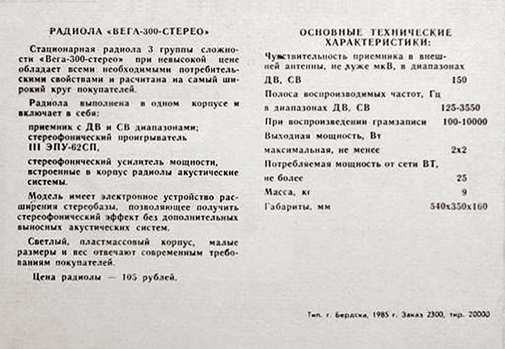 транзисторная радиола 3-го класса "Вега-300-стерео" с 1986 года выпускалась