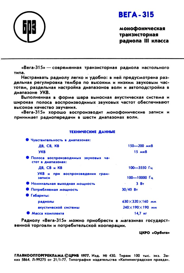 "Вега-315" подготовлена к выпуску с 1976 года Бердским радиозаводом. Она
