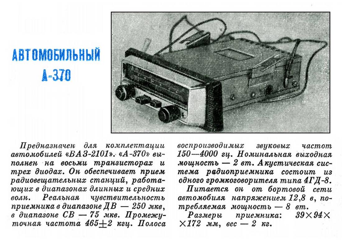 способом установки в автомобилях. Радиоприёмник ''А-370'' является модификацией
