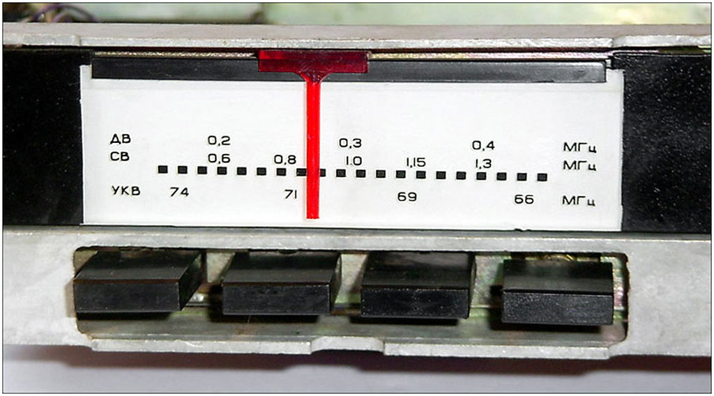 кнопочный переключатель диапазонов. Чувствительность: ДВ 190, СВ 55, УКВ