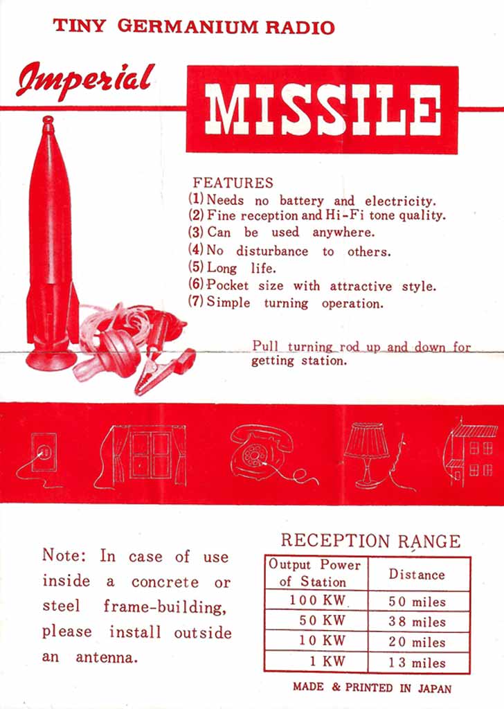 Детекторный радиоприёмник "Imperial Missile AR-60" выпускался возможно с 1961 года в Японии. Диапазон средних волн.