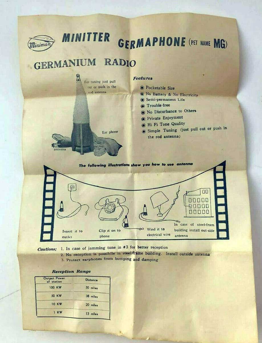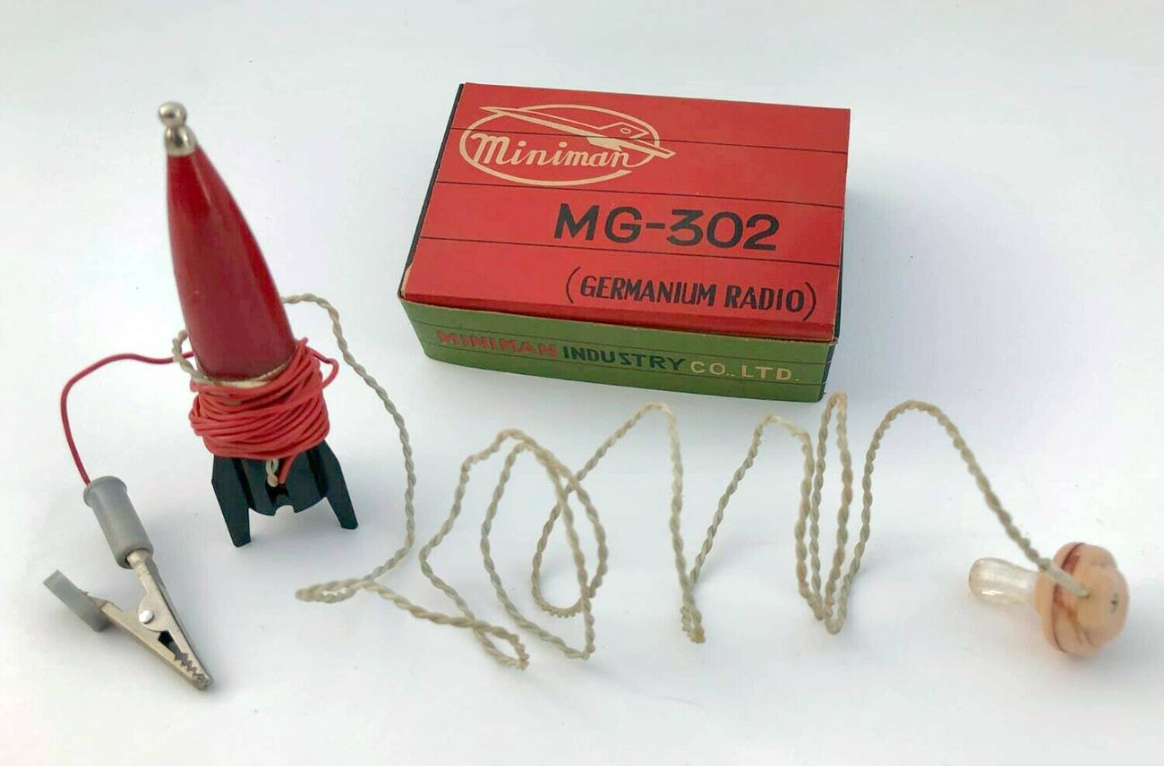 Карманный детекторный радиоприёмник "Mimiman MG-302" выпускала с 1961 года компания "Miniman Industry", Япония. Приёмник принимал мощные радиостанции на отрезок провода на расстоянии до 50 миль.