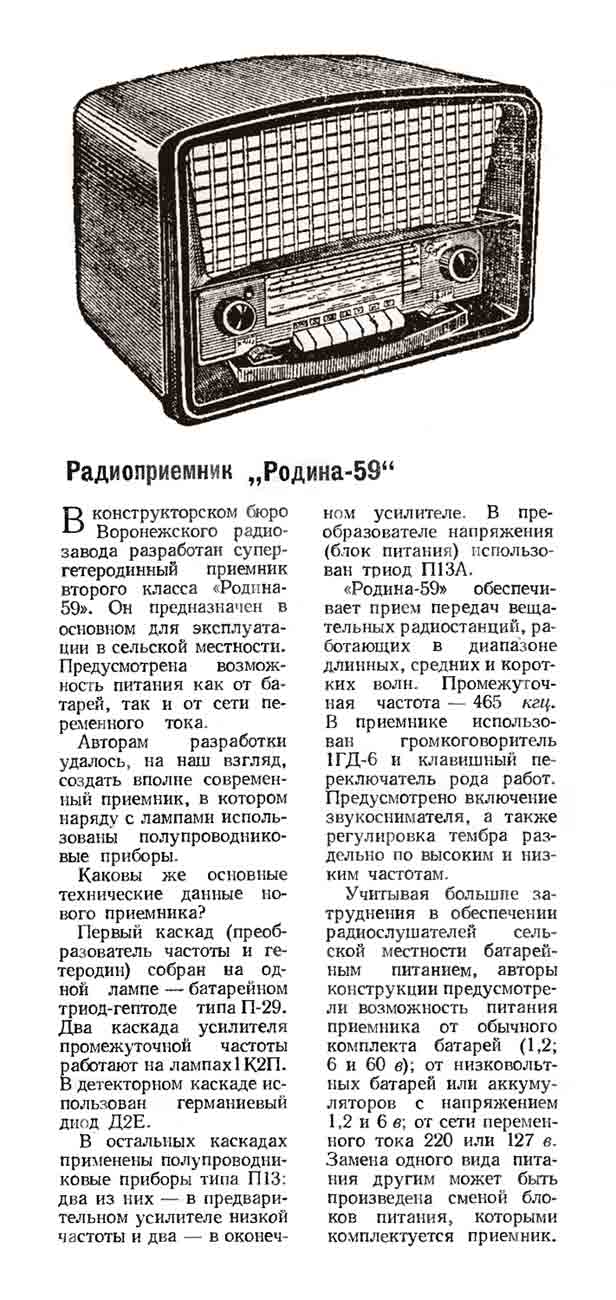 батарейный "Родина-59" с 1959 года выпускал Воронежский радиозавод. ''Родина-59''