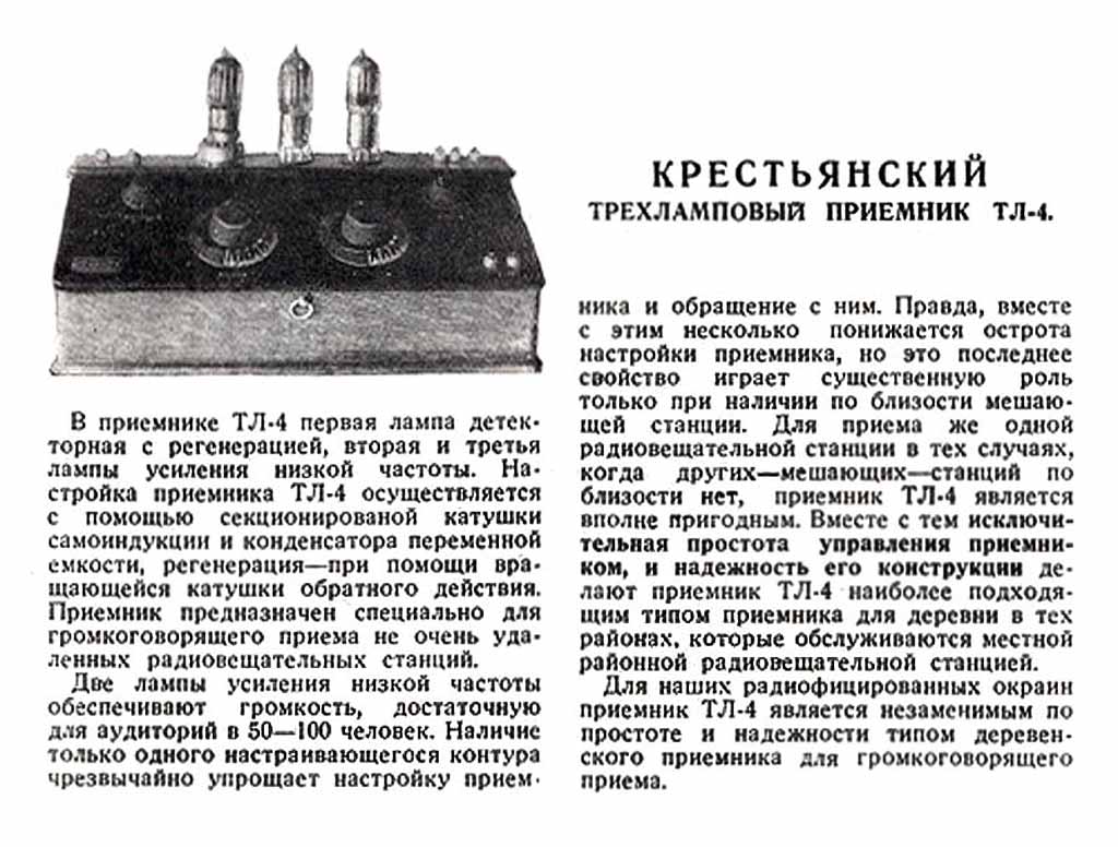 батарейный "ТЛ-4" с 1928 года выпускали заводы МЭМЗА и Мосэлектрик. Трех ламповый