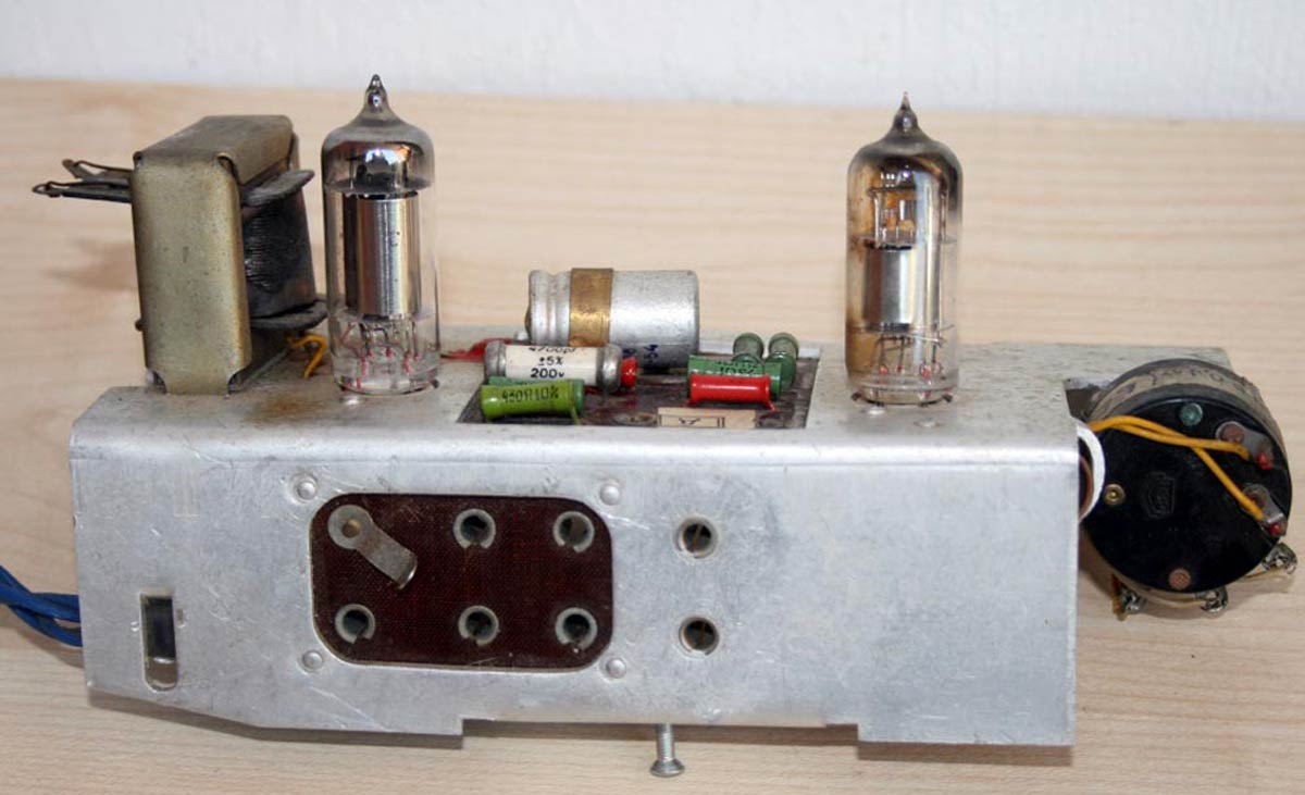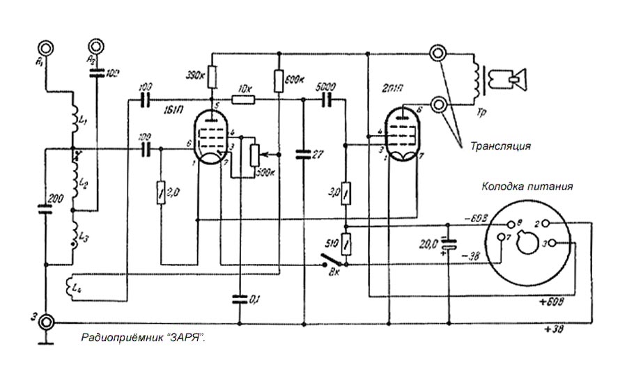 на двух радиолампах по схеме прямого усиления, с обратной связью по ВЧ.