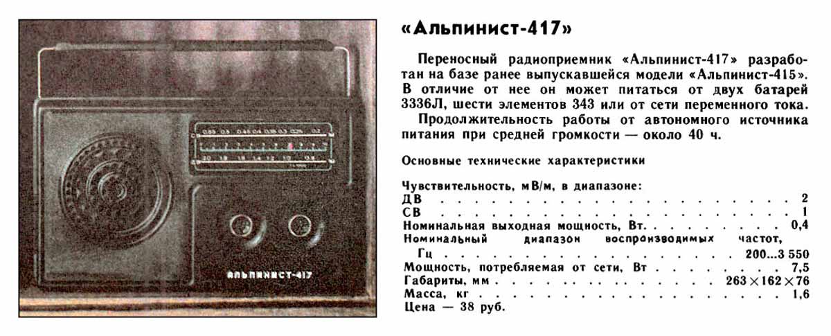 мм. Масса "417" модели 1,7 кг. Цена радиоприёмника ''Альпинист-417'' -
