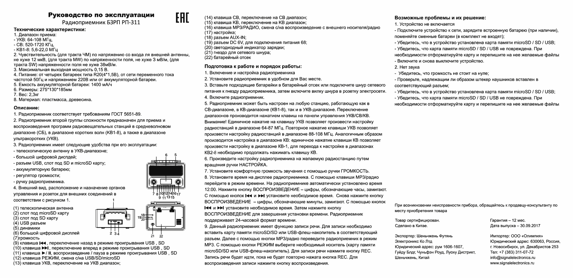 Радиоприёмник "БЗРП РП-311" предположительно с 2021 года производила для Российского рынка компания Шеньчжень Футянь Электроникс Ко., ЛТД, Китай. Импортёр: ООО "Олимпия", город Новосибирск.