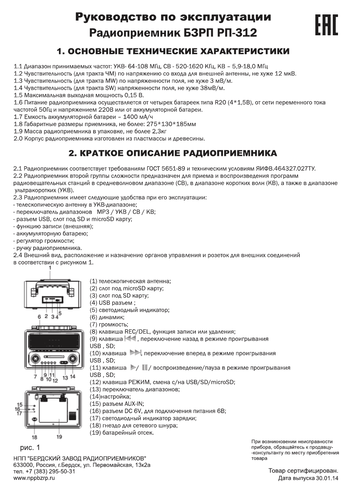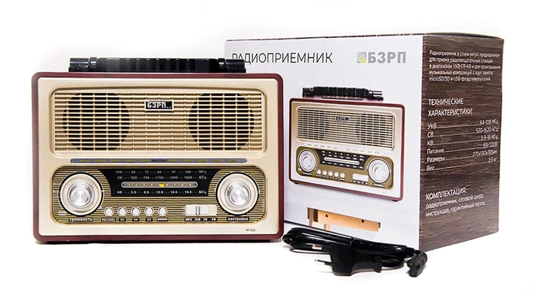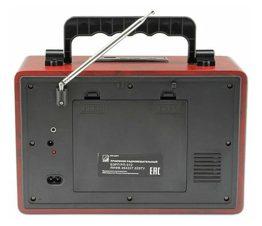 Радиоприёмник "БЗРП РП-312" выпускался возможно с 2014 года НПП "Бердский завод радиоприёмников". СВ, КВ 5,9-18 МГц, УКВ 64-108 МГц. Сеть, батареи R-20, аккумулятор.