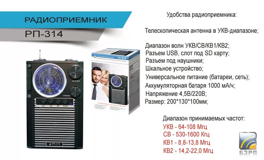 Радиоприёмник "БЗРП РП-314" с 2015 года производил Бердский завод радиоприёмников. Радиоприёмник имеет диапазоны СВ, два поддиапазона КВ и расширенный УКВ + проигрывание файлов MP-3.
