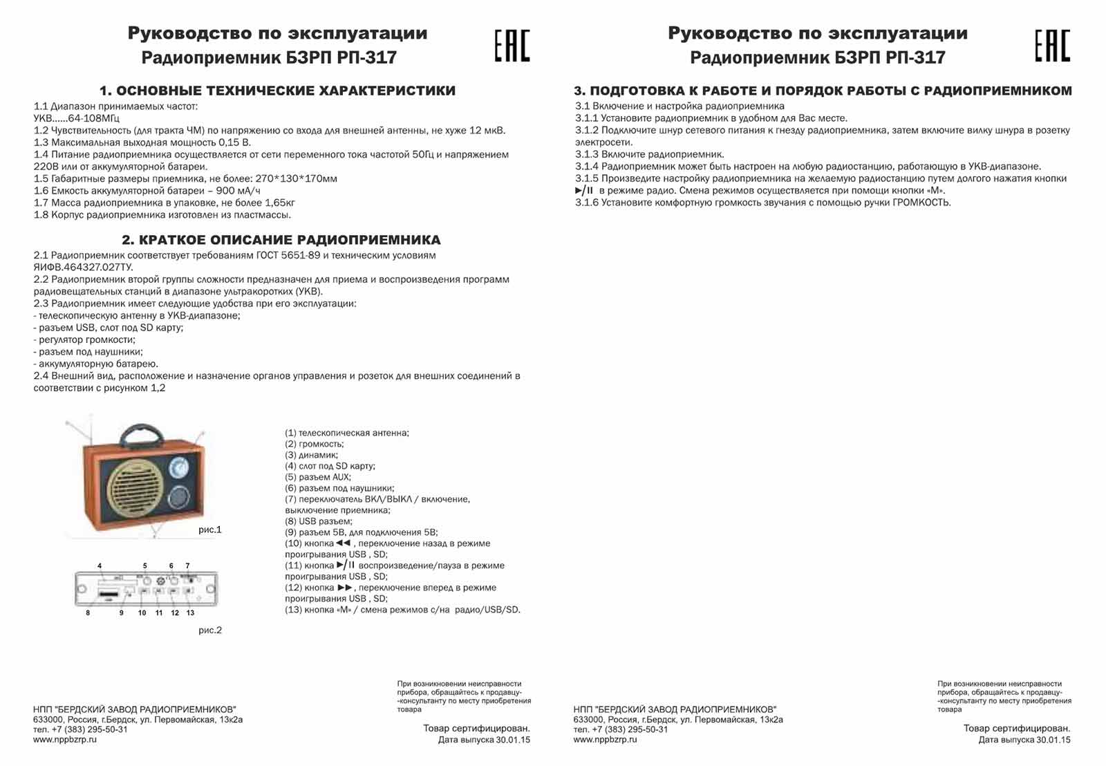Радиоприёмник "БЗРП РП-317" выпускал с 2015 года НПП Бердский завод радиоприёмников. Диапазон УКВ 64-108 МГц. Проигрывание файлов MP-3. Питание от сети или аккумулятора.