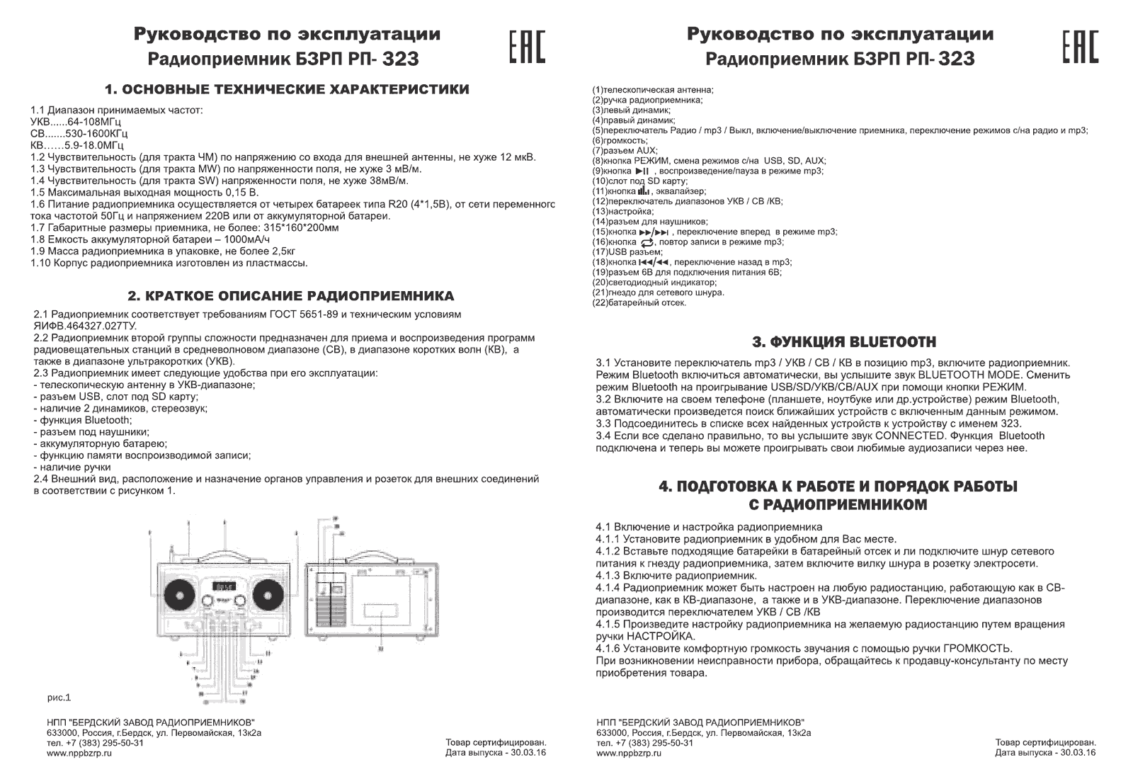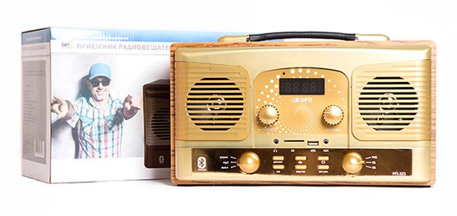 Радиоприёмник "БЗРП РП-323" выпускался предположительно с 2016 года НПП "Бердский завод радиоприёмников". Диапазоны: СВ, КВ (5,9...18 МГц), УКВ (64...108 МГц).