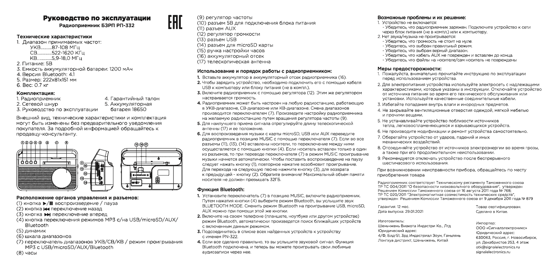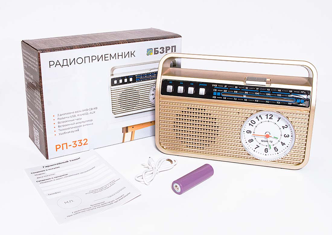 Радиоприёмник "БЗРП РП-332" выпускался возможно с 2021 года. Импортёр: ООО "Сигналэлектроникс", город Новосибирск. Экспортёр: Китай. Диапазоны: СВ, КВ и УКВ + MP-3. Питание от аккумулятора.