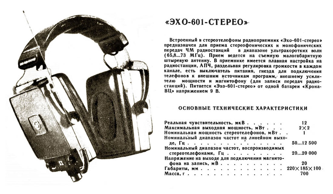 ток 10 мА. Габариты стереотелефонов - 220х185х100 мм. Масса 700 гр.