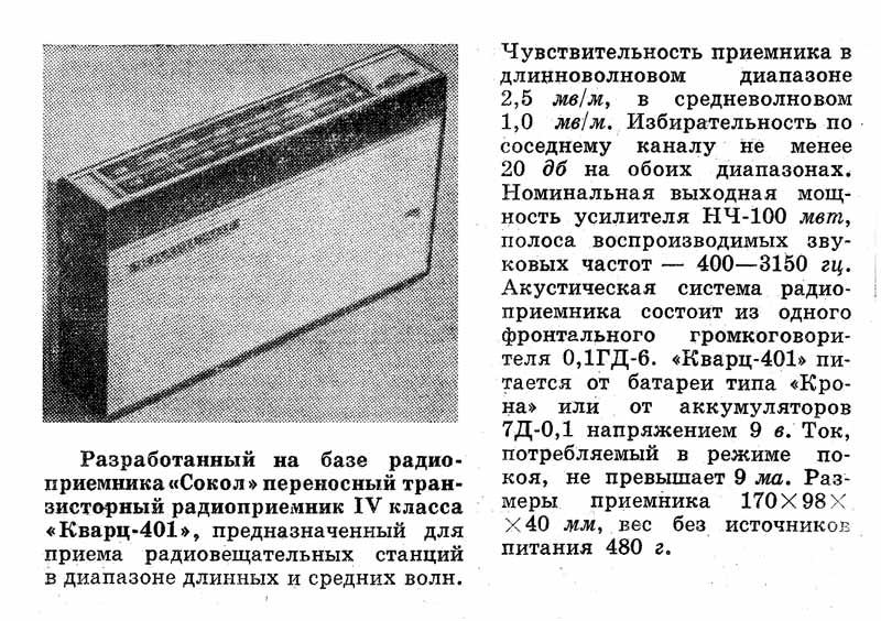 "Кварц-401" с 1970 года выпускал Кыштымский радиозавод. Радиоприёмник предназначен