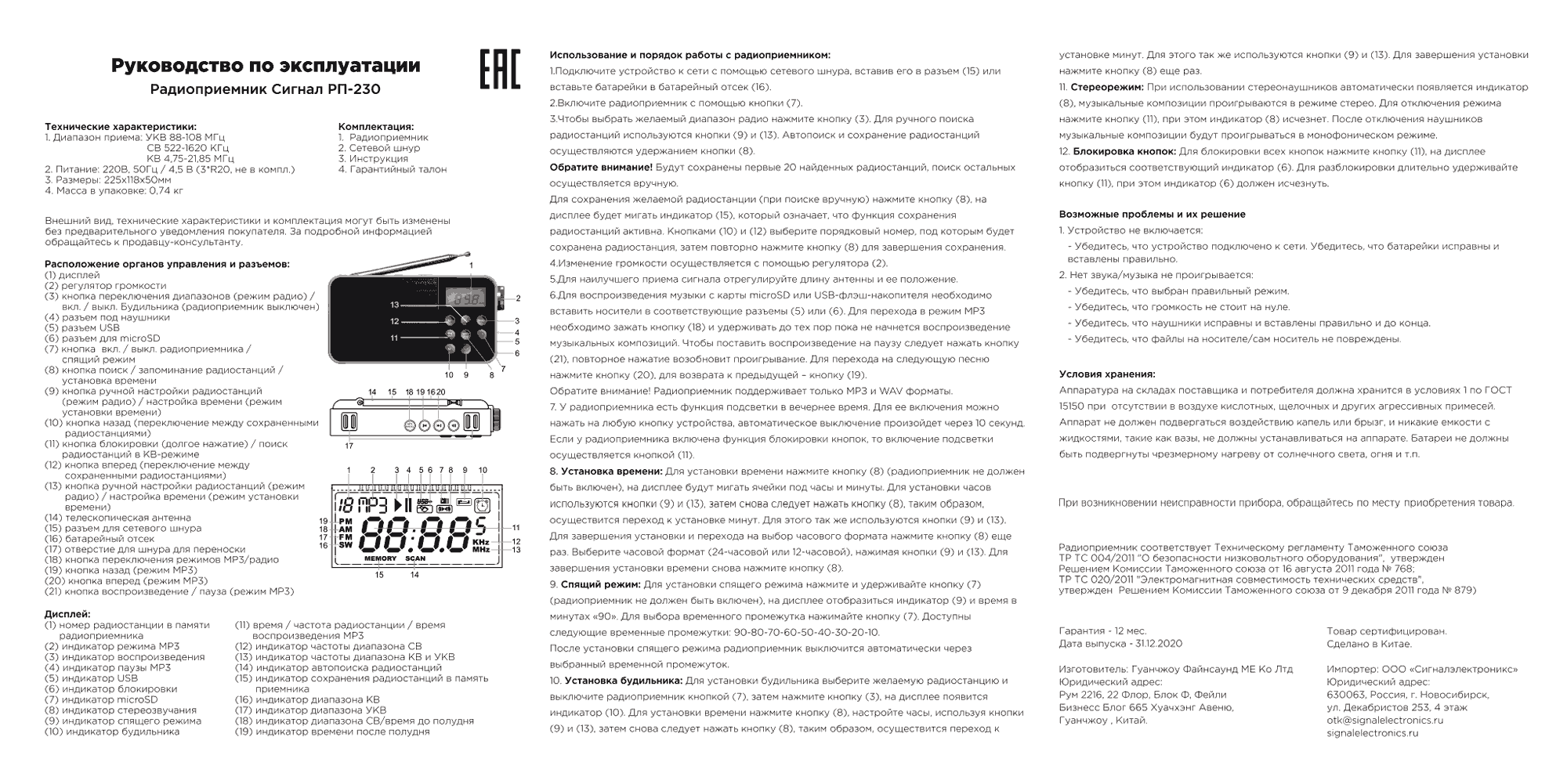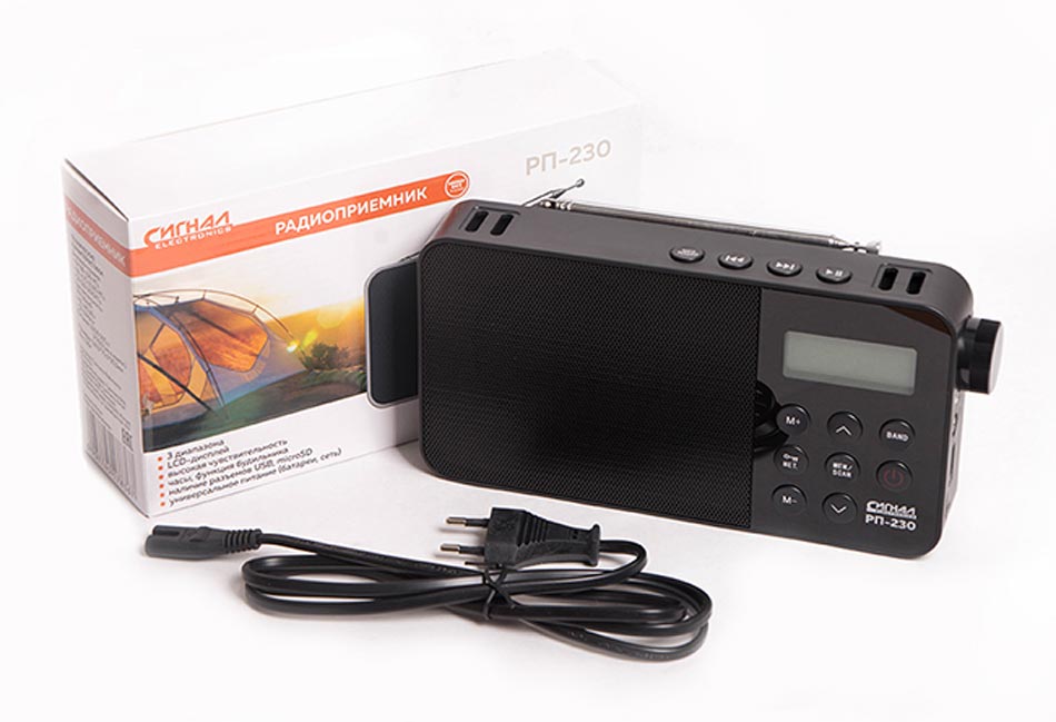 Радиоприёмник "Сигнал РП-230" выпускался возможно с 2020 года. Изготовитель - Китай. Импортёр - ООО "Сигналэлектроникс". Диапазоны: УКВ, СВ, КВ. Электронные часы. Поддержка файлов типа МП-3.