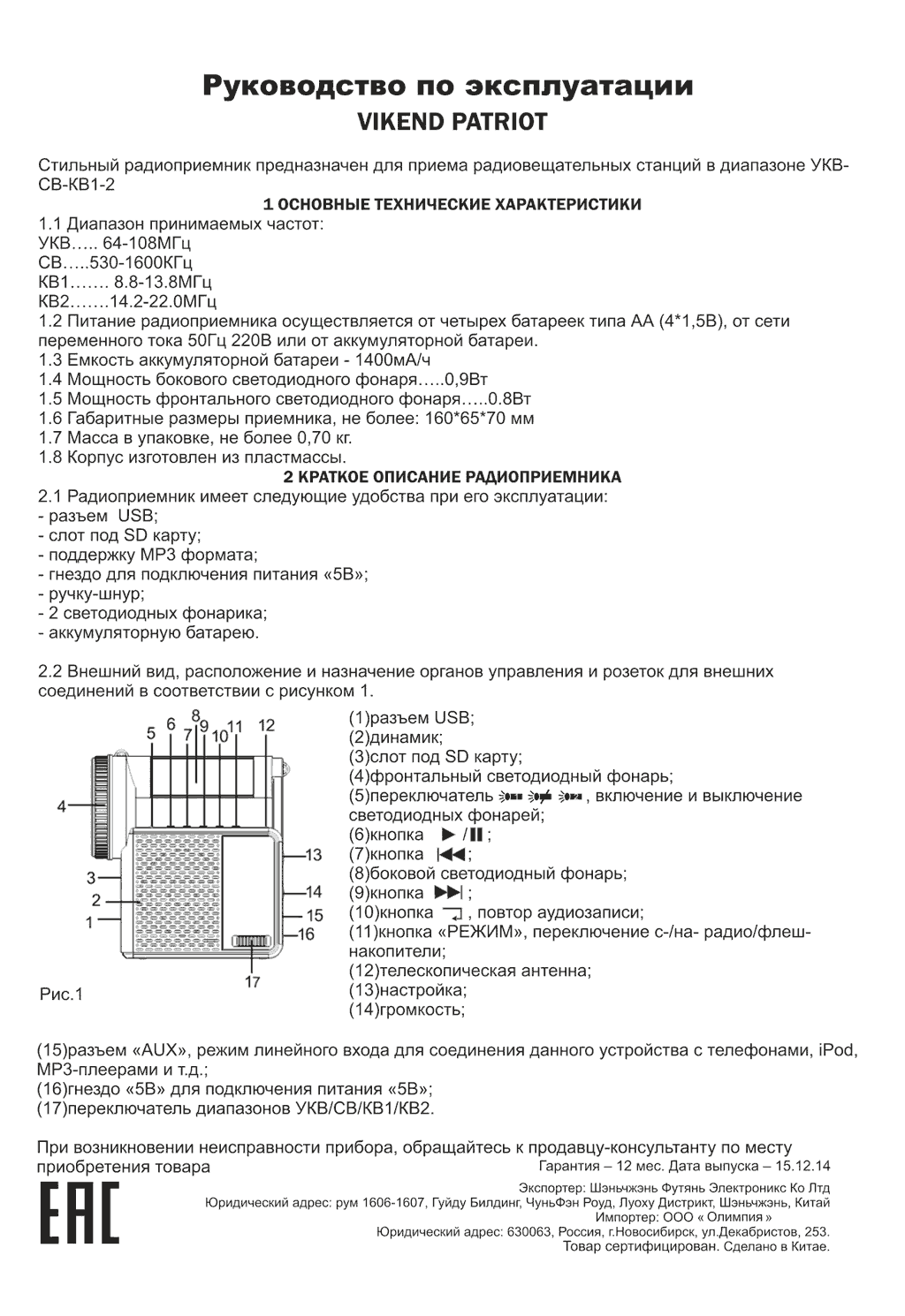 Радиоприёмник "Vikebd Patriot" выпускался с 2014 года. Экспортёр - Китай. Импортёр - ООО "Олимпия", город Новосибирск. Диапазоны УКВ, СВ, КВ (2). Поддержка MP-3. 2 светодиодных фонаря. Видеосюжет.