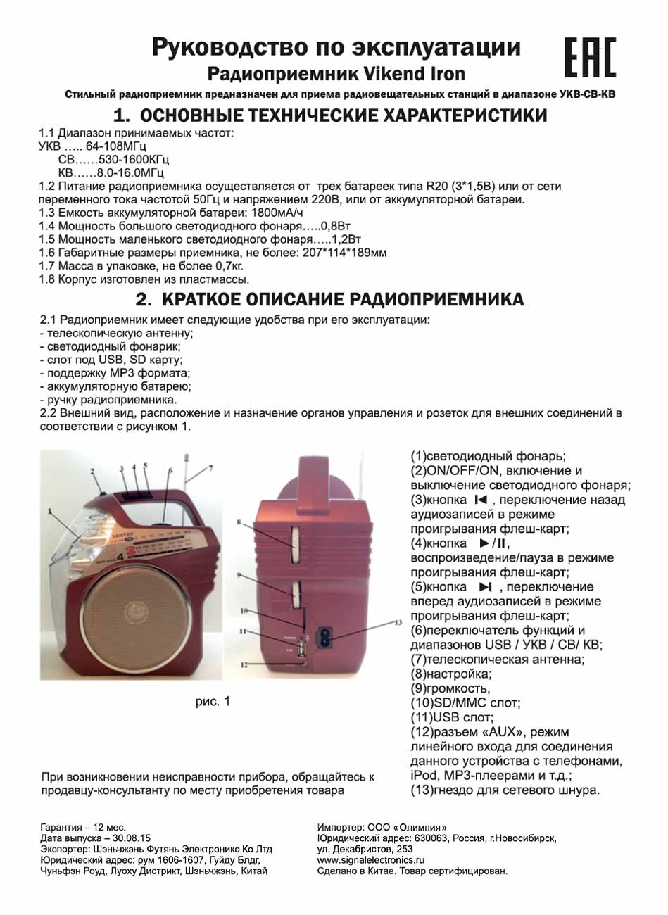 Радиоприёмник "Vikend Iron" выпускался возможно с 2015 года. Экспортёр - Китай. Импортёр - ООО "Олимпия", Новосибирск. Диапазоны: СВ, КВ, УКВ. Поддержка MP-3. Два фонаря. Видеосюжет.