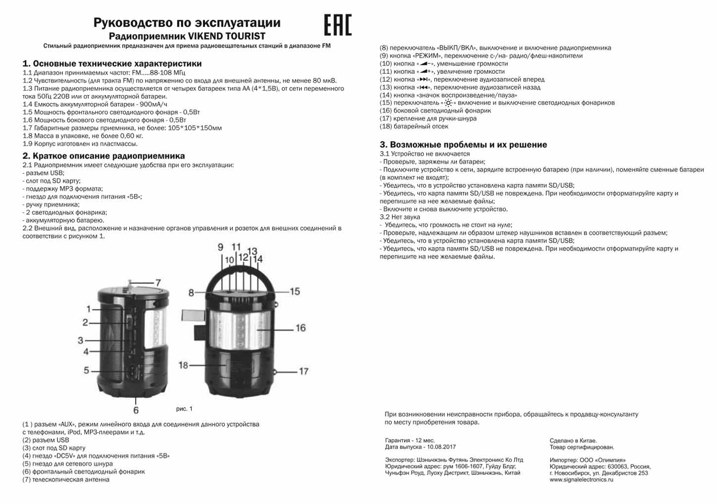 Радиоприёмник "Vikend Tourist" выпускался возможно с 2017 года. Экспортёр - Китай. Импортёр - ООО "Олимпия", Новосибирск. Диапазон 88...108 МГц. Поддержка файлов MP-3.