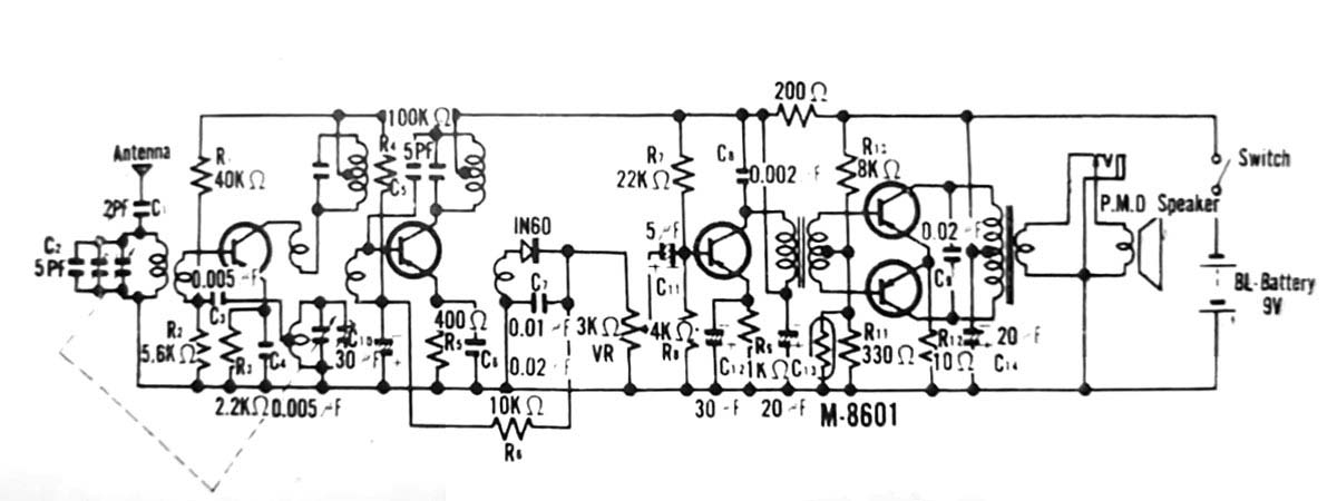 АМ - 540...1600 кГц. ПЧ - 455 кГц. Питание от батареи 9 вольт. Из-за малого