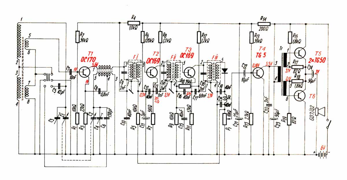 на шести транзисторах. Диапазоны LW - 150...270 кГц, MW - 520...1600 кГц.
