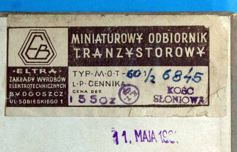 Портативный радиоприёмник "Koliber MOT-601" выпускался с 1960 года фирмой "Unitra ELTRA", Польша. Супер. 6 транзисторов. Диапазон СВ 520...1600 кГц, или СВ и ДВ 150...270 кГц. Питание - 4 элемента АА. Диаметр громкоговорителя 7 см. Диапазон частот 330...3300 Гц. Выходная мощность 80 мВт
