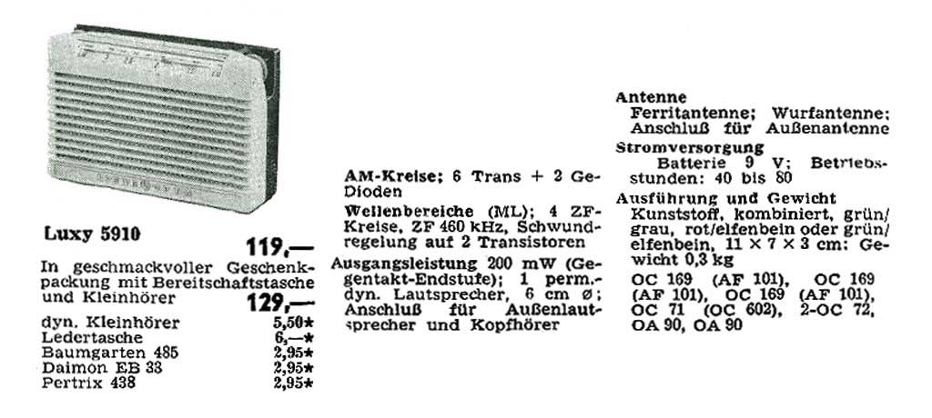 Портативный радиоприёмник "Loewe Opta 5910" (Luxy) выпускался с 1960 года компанией "Loewe" (Opta), ФРГ. Супергетеродин на 6-ти транзисторах. Два диапазона, LW - 150...300 кГц, MW - 520...1600 кГц. ПЧ 460 кГц. Питание - 9 вольт. Максимальная выходная мощность - 200 мВт. Громкоговоритель диаметром 6 см. Диапазон воспроизводимых частот - 330...3300 Гц. Габариты приёмника - 110х70х30 мм. Масса - 300 грамм.