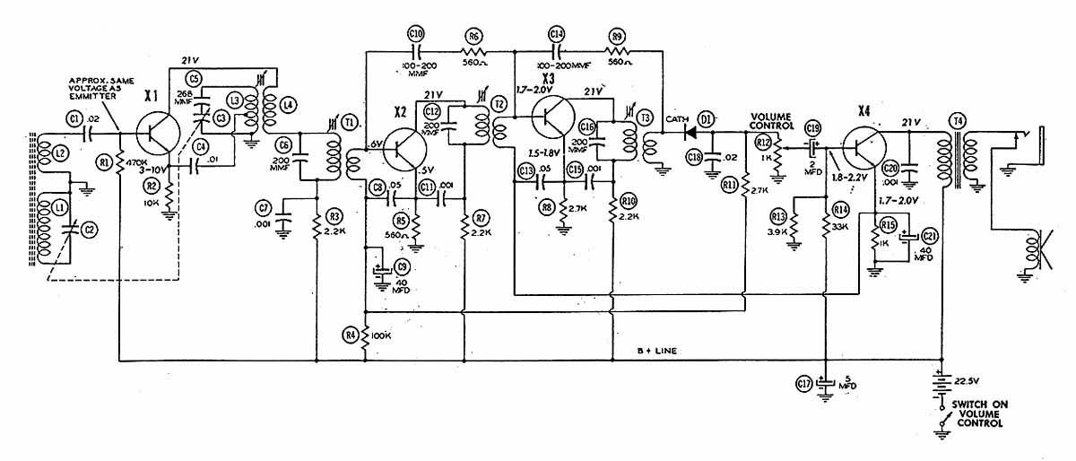 кГц. ПЧ 262 кГц. Питание - батарея напряжением 22,5 вольта. Масксимальная