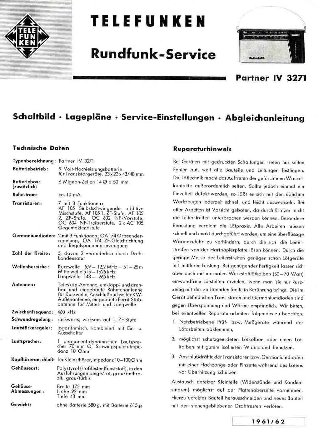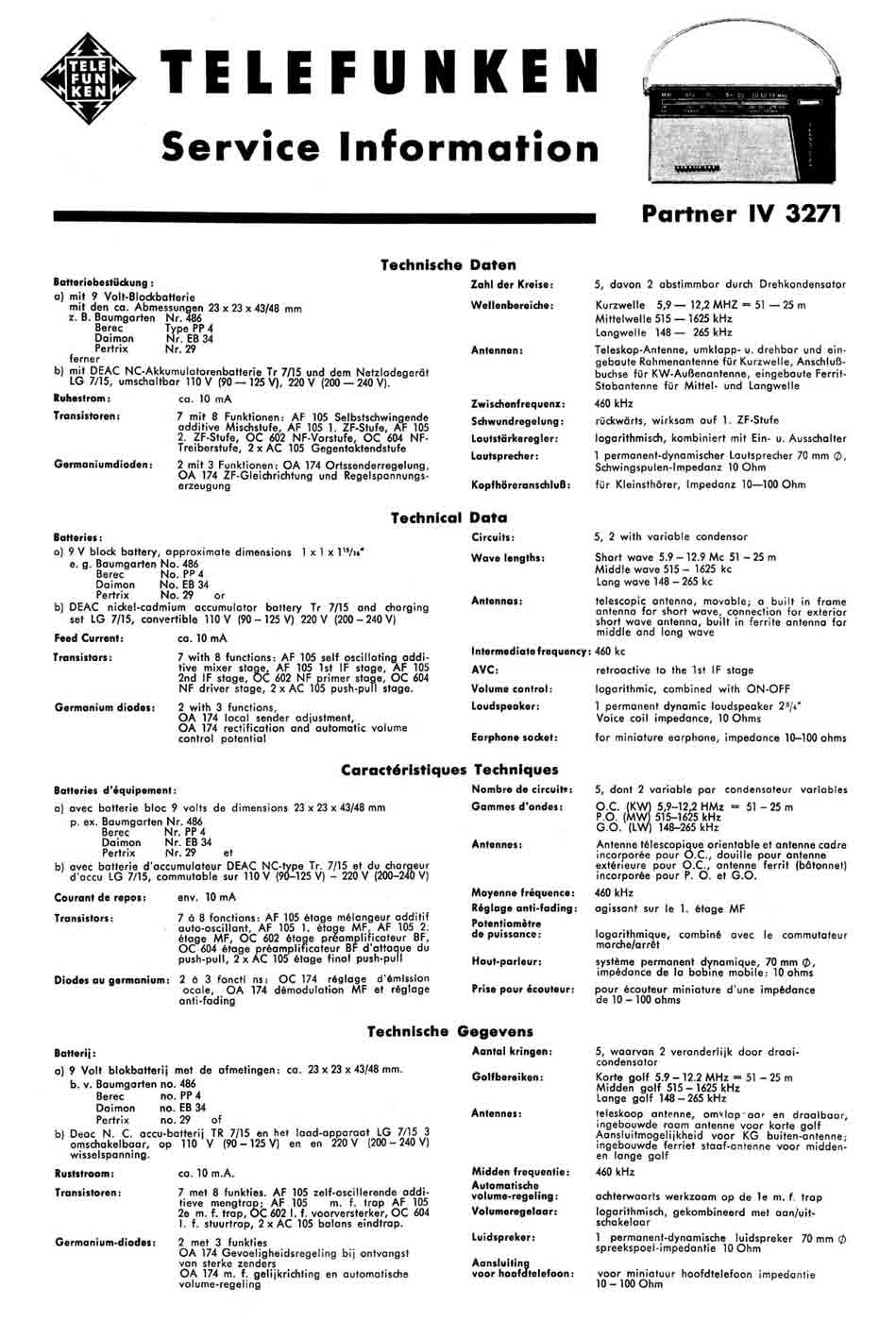 Портативный радиоприёмник "Telefunken Partner IV 3271" выпускался с 1961 года фирмой "Telefunken", Германия. Информация о радиоприёмнике в проспектах.