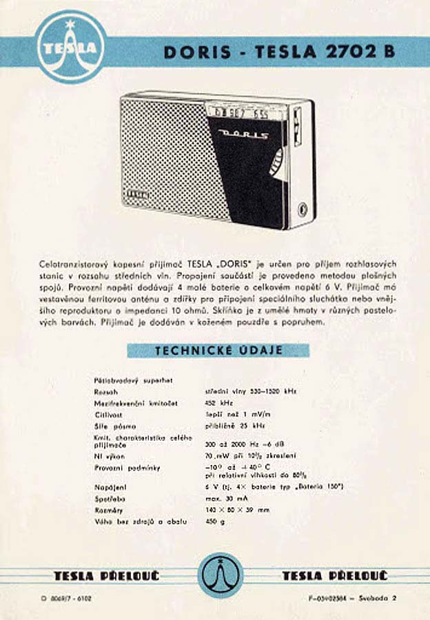 (Tesla 2702B) выпускался с 1961 года фирмой "Tesla", Чехословакия. Супергетеродин