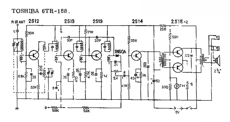 Портативный радиоприёмник "Toshiba 6TR-188" выпускался с 1958 года корпорацией "Tokyo Shibaura Electric" Co. LTD. (Toshiba), Кавасаки, Япония. Супергетеродин на 6-ти транзисторах. Диапазон - 540...1600 кГц. ПЧ - 455 кГц. Питание - 9 вольт. Габариты радиоприёмника - 148x82,5x41 мм.