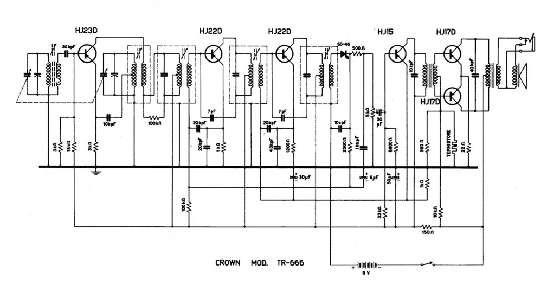 в США. Супергетеродин. 6 транзисторов. Диапазон АМ - 535...160 кГц. ПЧ