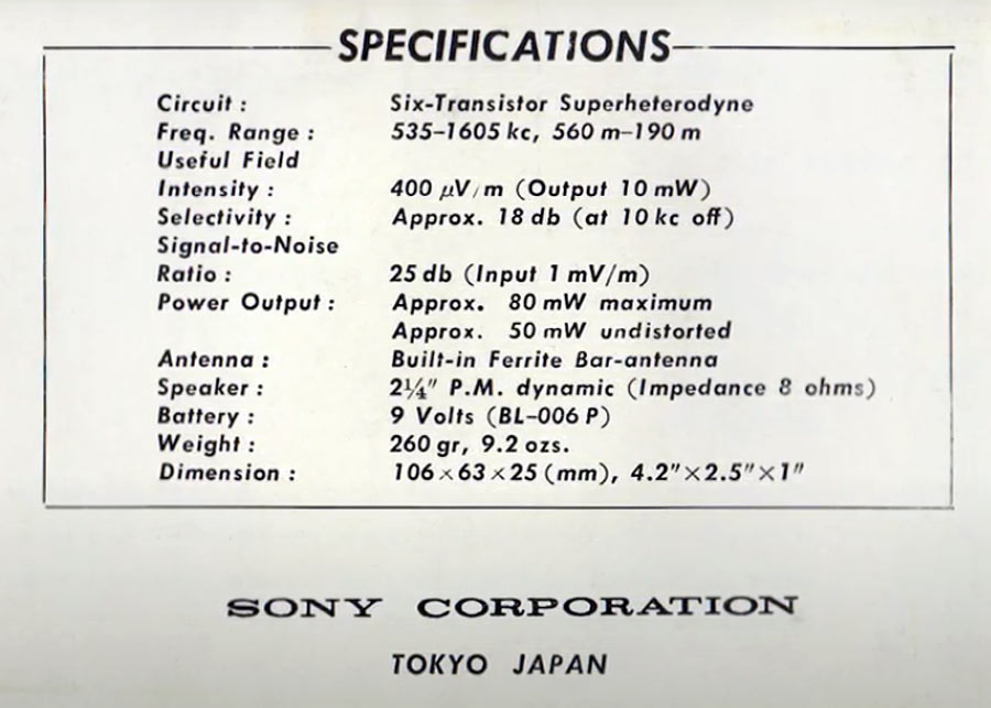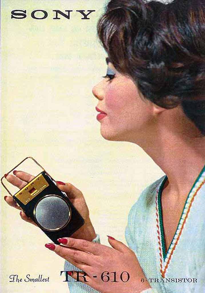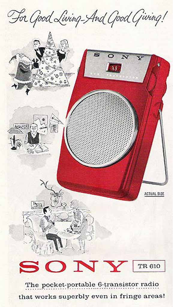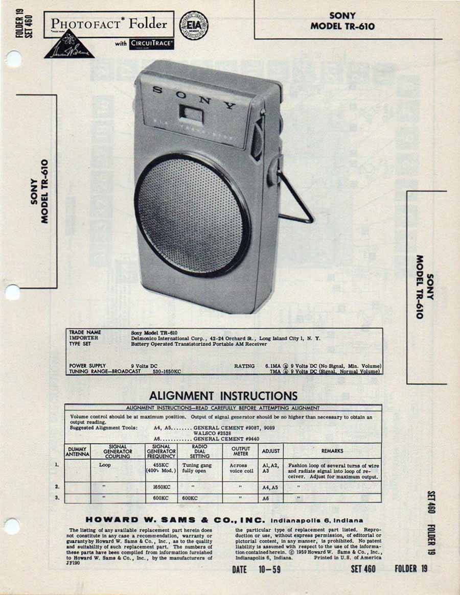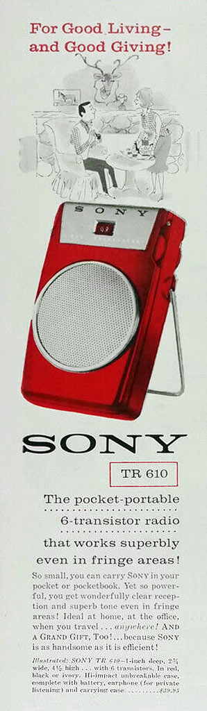 Портативный радиоприёмник "Sony TR-610" выпускался с 1958 года Японской корпорацией "Sony". Супергетеродин. 6 транзисторов. Диапазон - АМ. Питание 9 вольт. Чвствительность - 0,4 мВ/м. Избирательность 18 дБ. Диаметр громкоговорителя 6,4 см. Максимальная выходная мощность 80 мВт. Габариты 106х63х25 ммм. Масса 260 гр. Цвета корпуса: красный, белый, зелёный, чёрный.