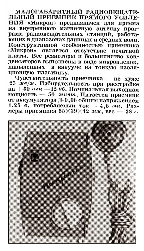 (1870-1970 г.). Радиоприёмник ''Микрон'' предназначен для приёма на внутреннюю