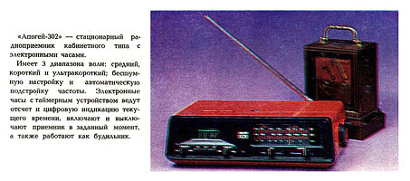 Кабинетный радиоприёмник с электрон. часами "Апогей-302" подготовлен к выпуску с 1982 года Кимовским радиоэлектромеханическим заводом.