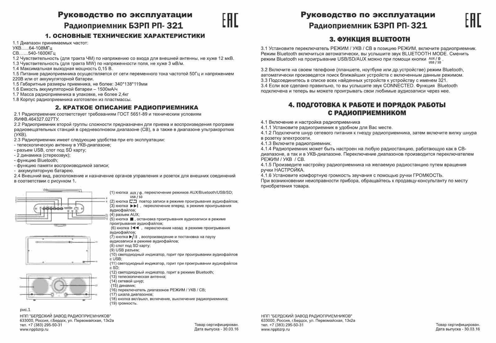 Радиоприёмник "БЗРП РП-321" выпускался возможно с 2016 года НПП "Бердский завод радиоприёмников". Диапазон СВ, УКВ (64...108 МГц). Питание от сети или аккумуляторной батареи.