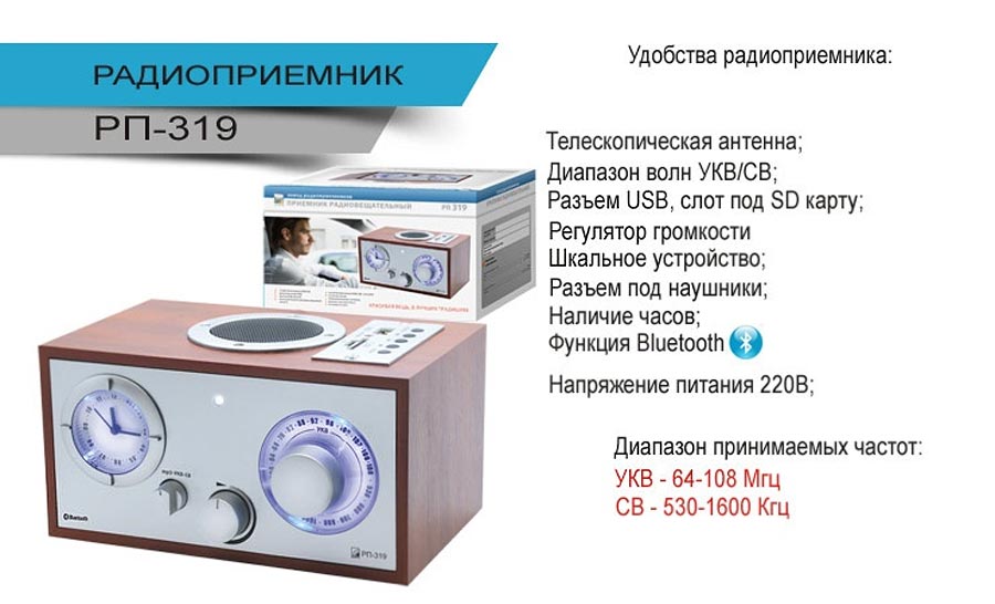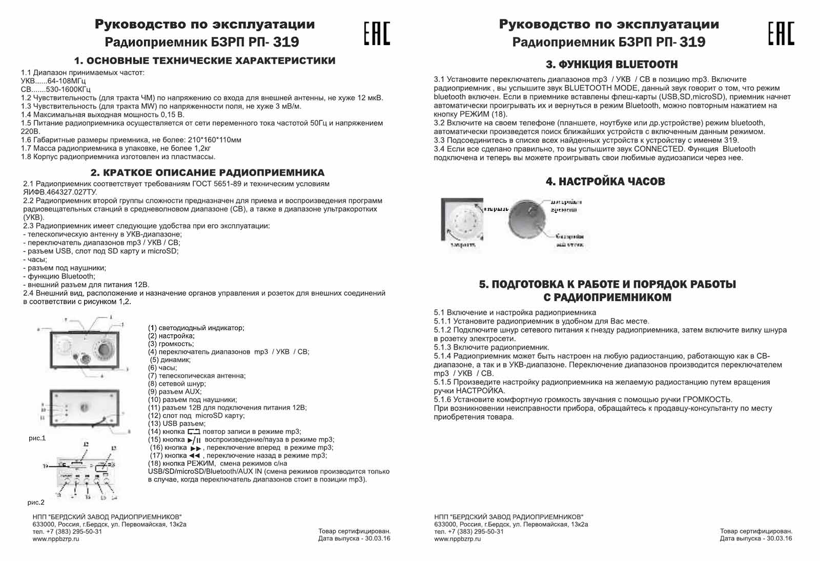 Радиоприёмник БЗРП РП-319" выпускался возможно с 2016 года. Экспортёр Китай. Импортёр Бердский завод радиоприёмников. Диапазоны: СВ, УКВ + проигрыватель файлов MP-3.