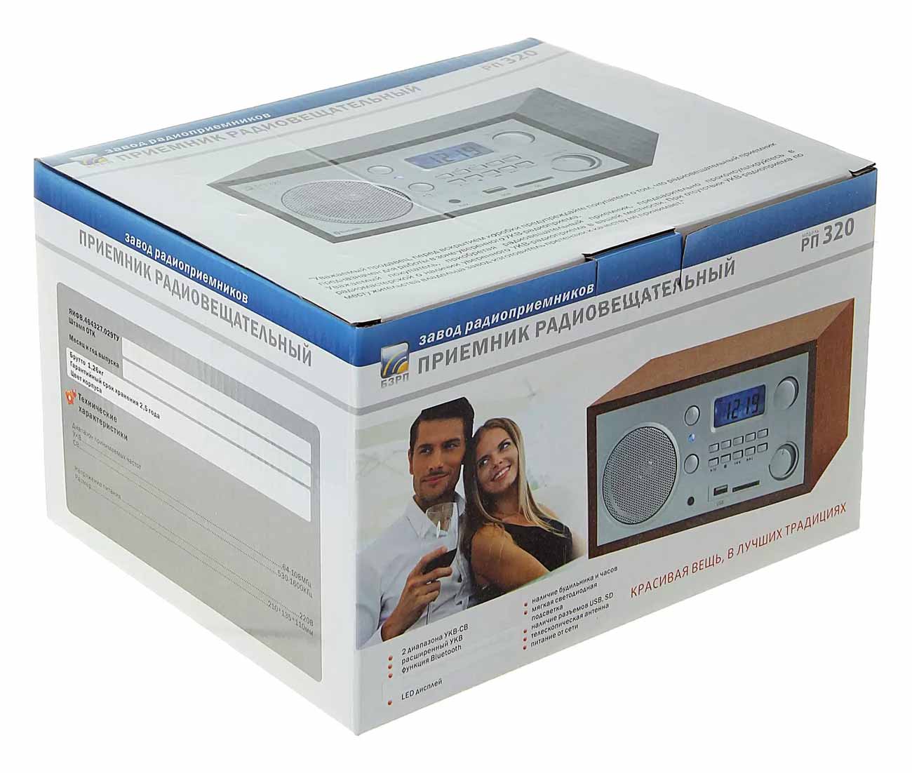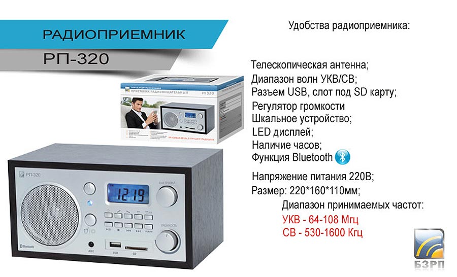 Приёмник радиовещательный "БЗРП РП-320" производился предположительно с 2016 года "Бердским заводом радиоприёмников". Сетевой УКВ, СВ + MP-3 супергетеродин.