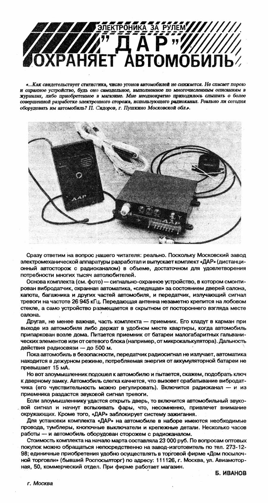 Дистанционный автосторож с радиоканалом "Дар" с 1991 года выпускал Московский завод электромеханической аппаратуры НПО "Ротор". Первый файл - рекламный проспект из журнала "Радио № 6 за 1993 год.
