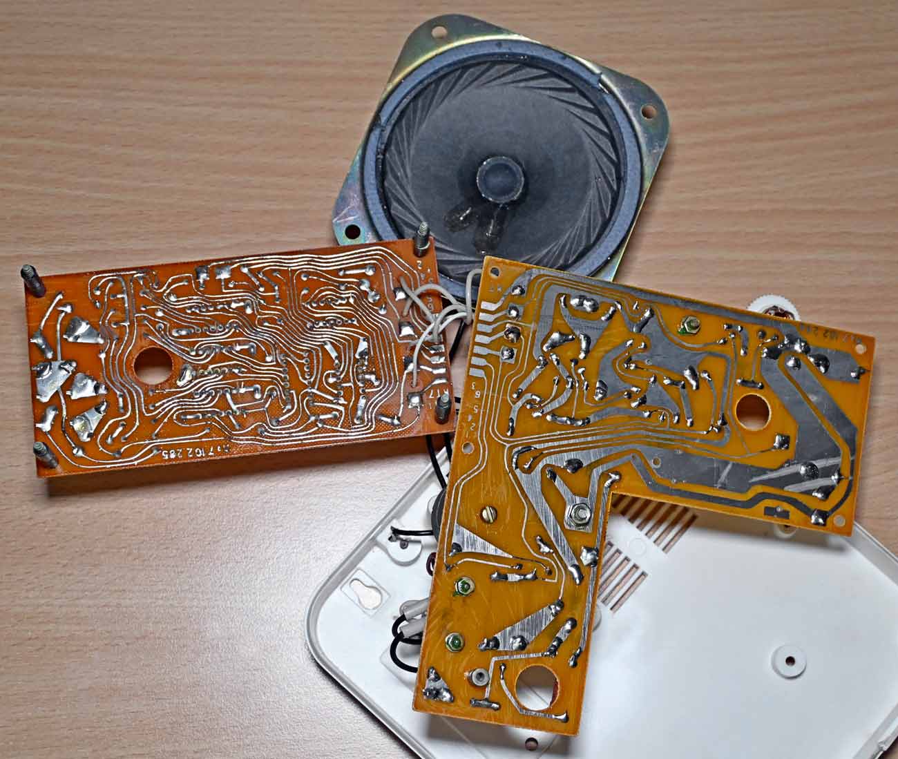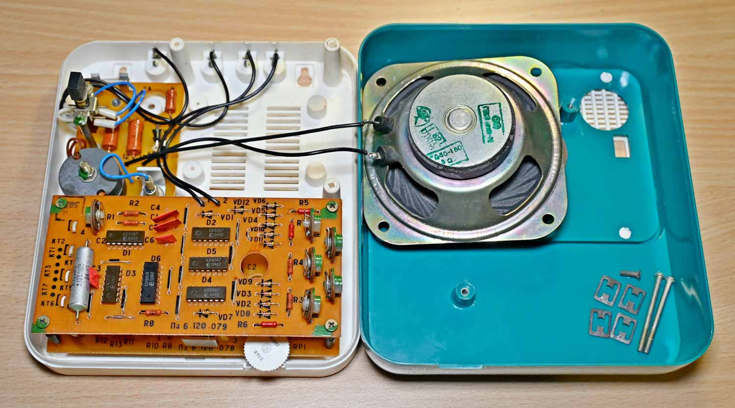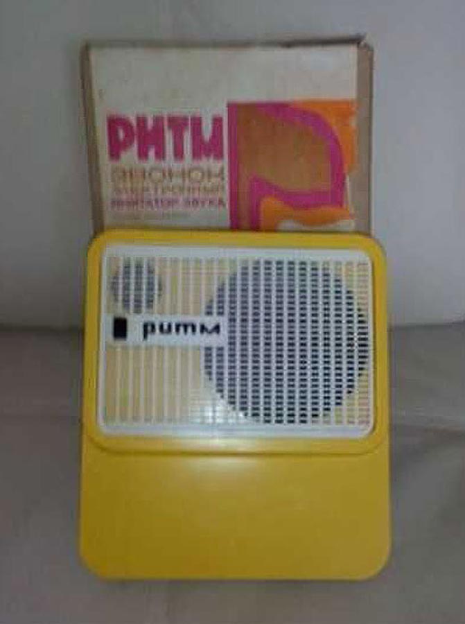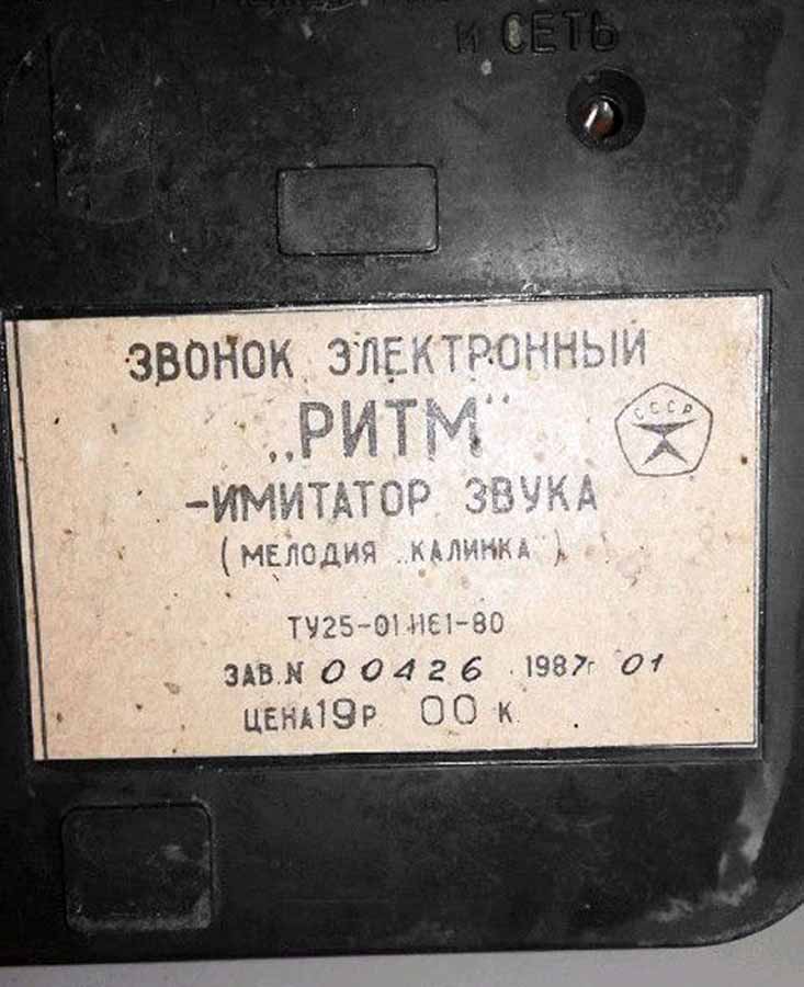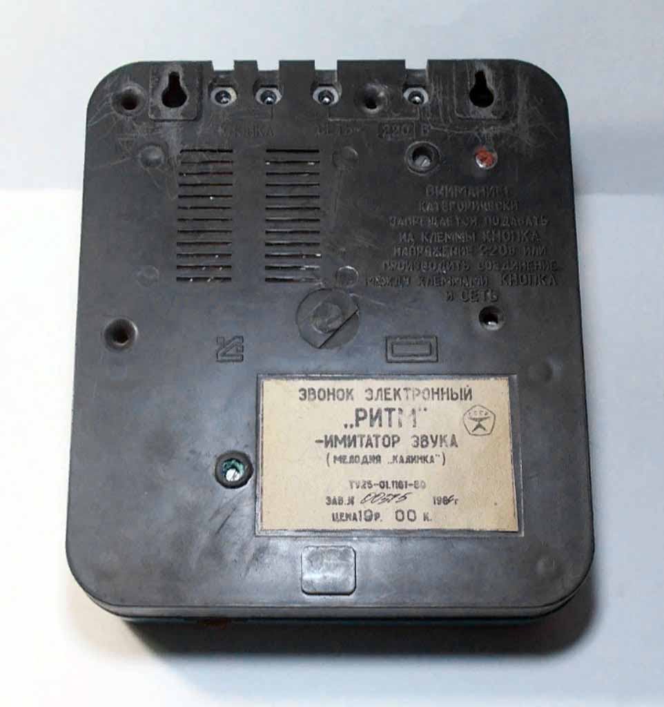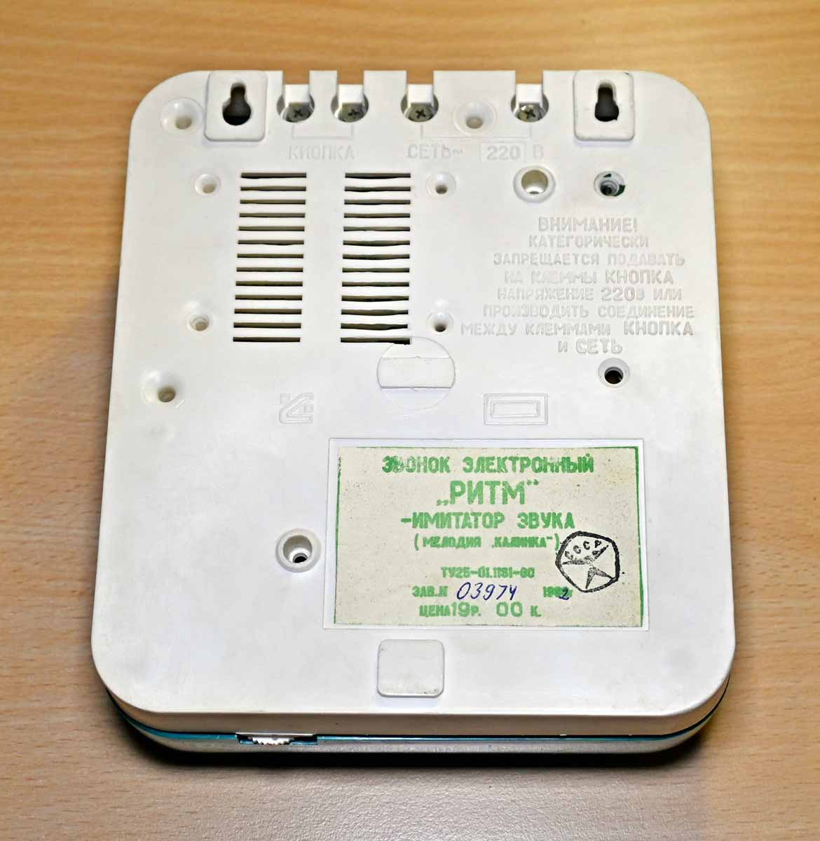 Звонок электронный "Ритм" (иммитатор звука) выпускался возможно с 1982 года Смоленским ПО "Искра". При нажатии кнопки звучит мелодия "Калинка".