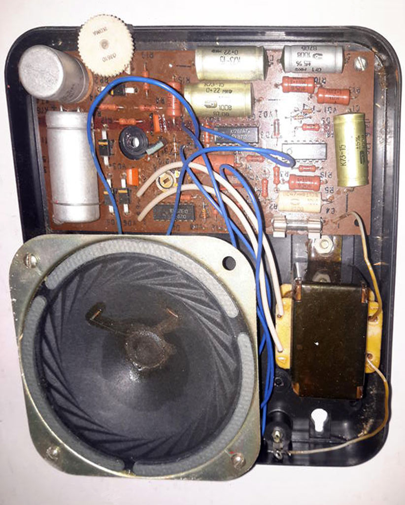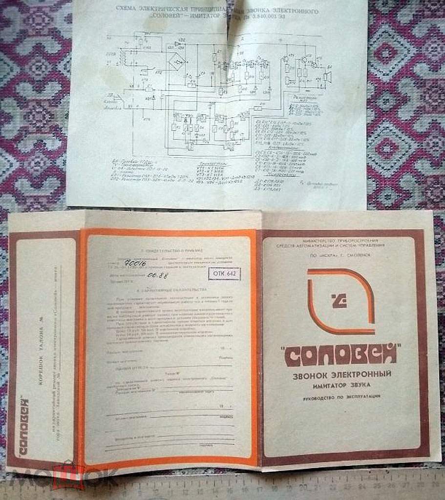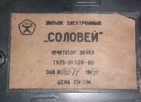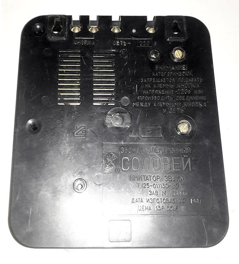 Звонок электронный "Соловей" (имитатор звука) выпускался предположительно с 1981 года Смоленским ПО "Искра". Питается звонок от электрической сети.