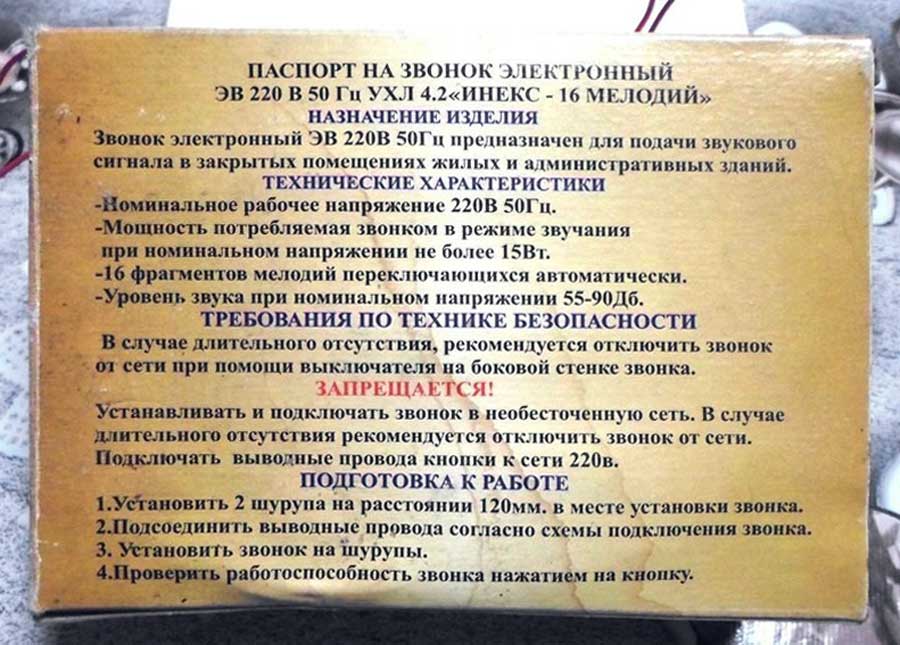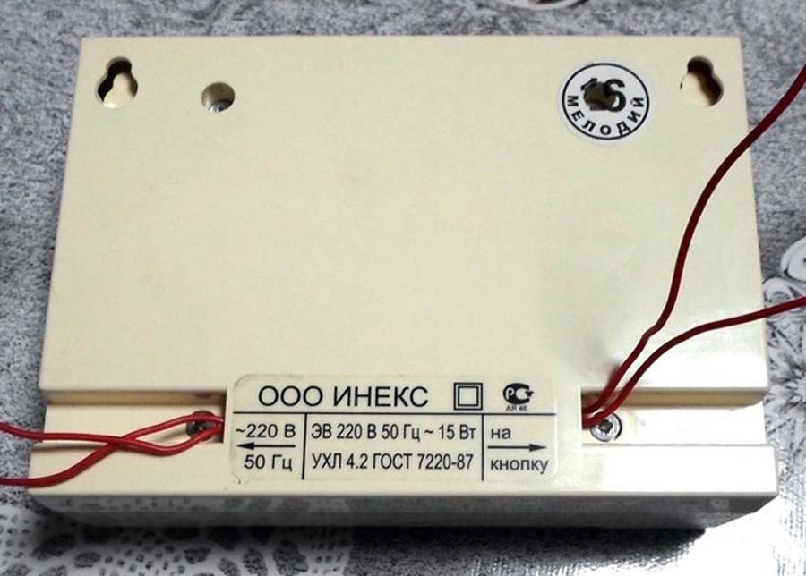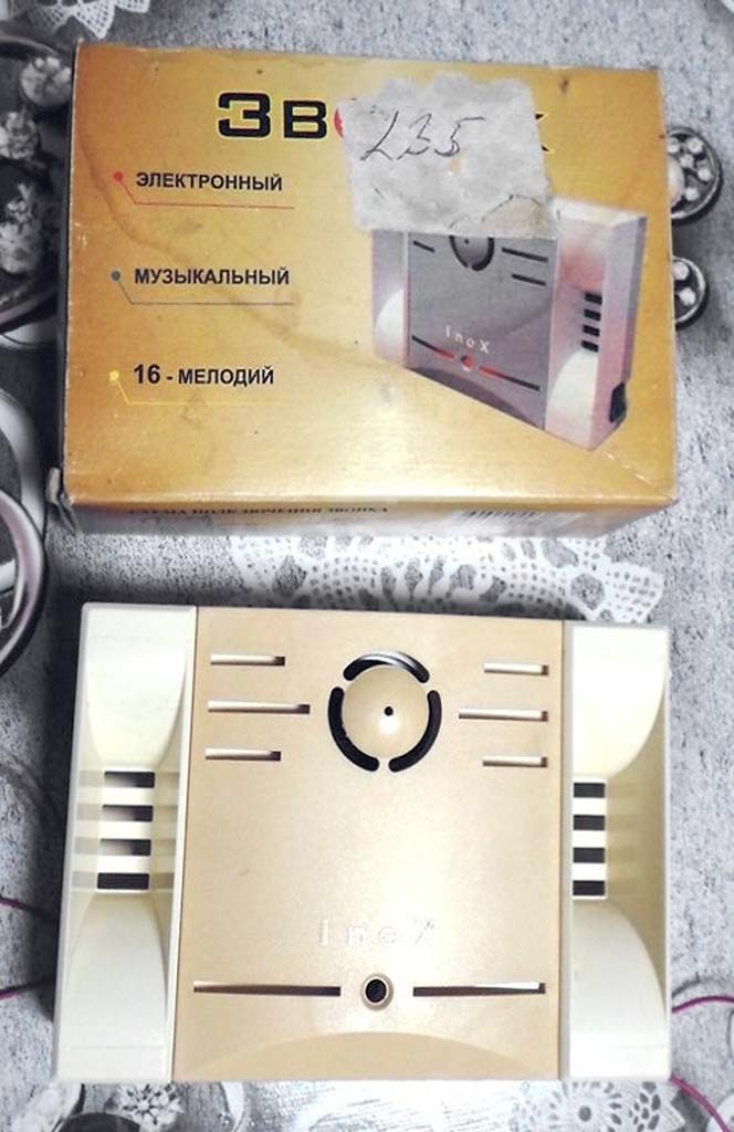 Электронный дверной звонок "УХЛ-4.2" на 16 мелодий производило ООО "ИНЕКС" предположительно с 1995 года. Предназначен для подачи звукового сигнала в закрытых помещениях.
