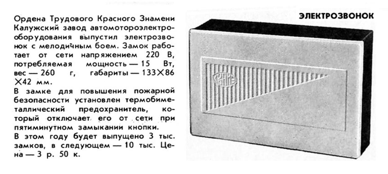 Электрозвонок с мелодичным боем выпускался с 1978 года Калужским заводом Автомотоэлектрооборудования.
