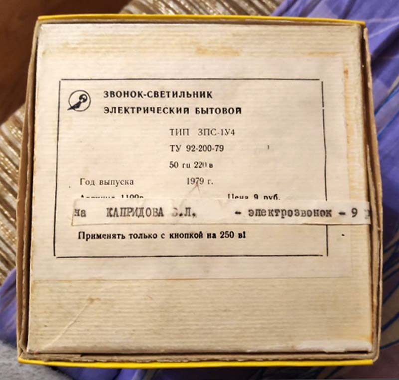 Звонок-светильник электрический бытовой выпускался предположительно с 1979 года. Тип ЗПС-1У4. Рассчитан на напряжение 220 В. Подсветка.