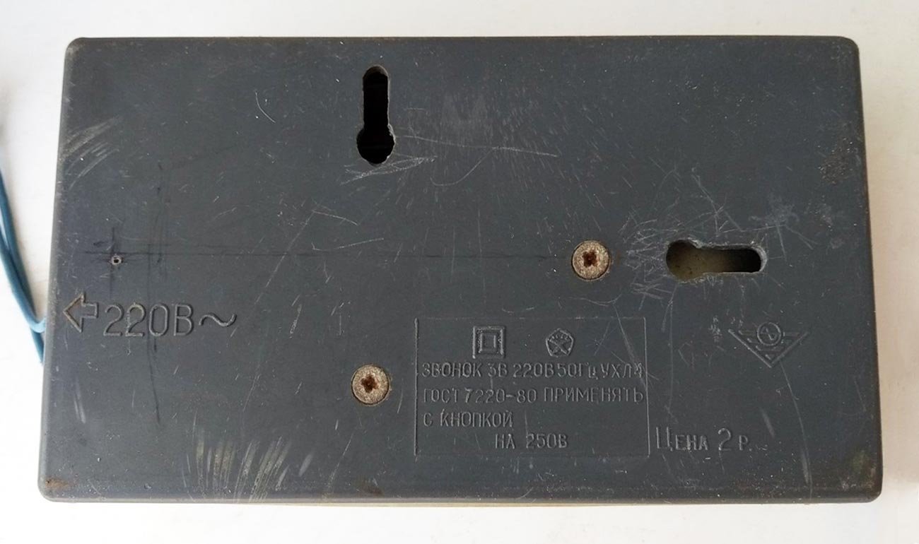 Дверной электрический звонок "ЗВ" выпускался предположительно с 1981 года. Изготовителя можно найти по логотипу на корпусе звонка. Других данных нет.