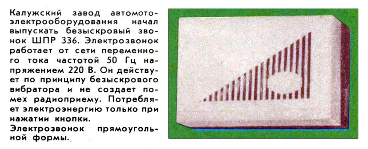 Электрический безыскровый звонок "ШПР-336" выпускался с 1973 года Калужским заводом автомотоэлектрооборудования.