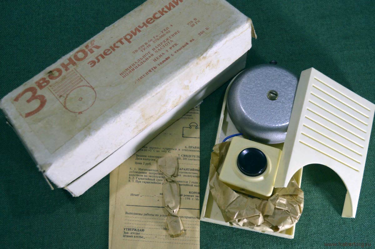 Звонок электрический "ЗВ-220В" выпускался возможно с 1982 года Московским электрозаводом имени Куйбышева. Стандартный вибрационный электрозвонок.