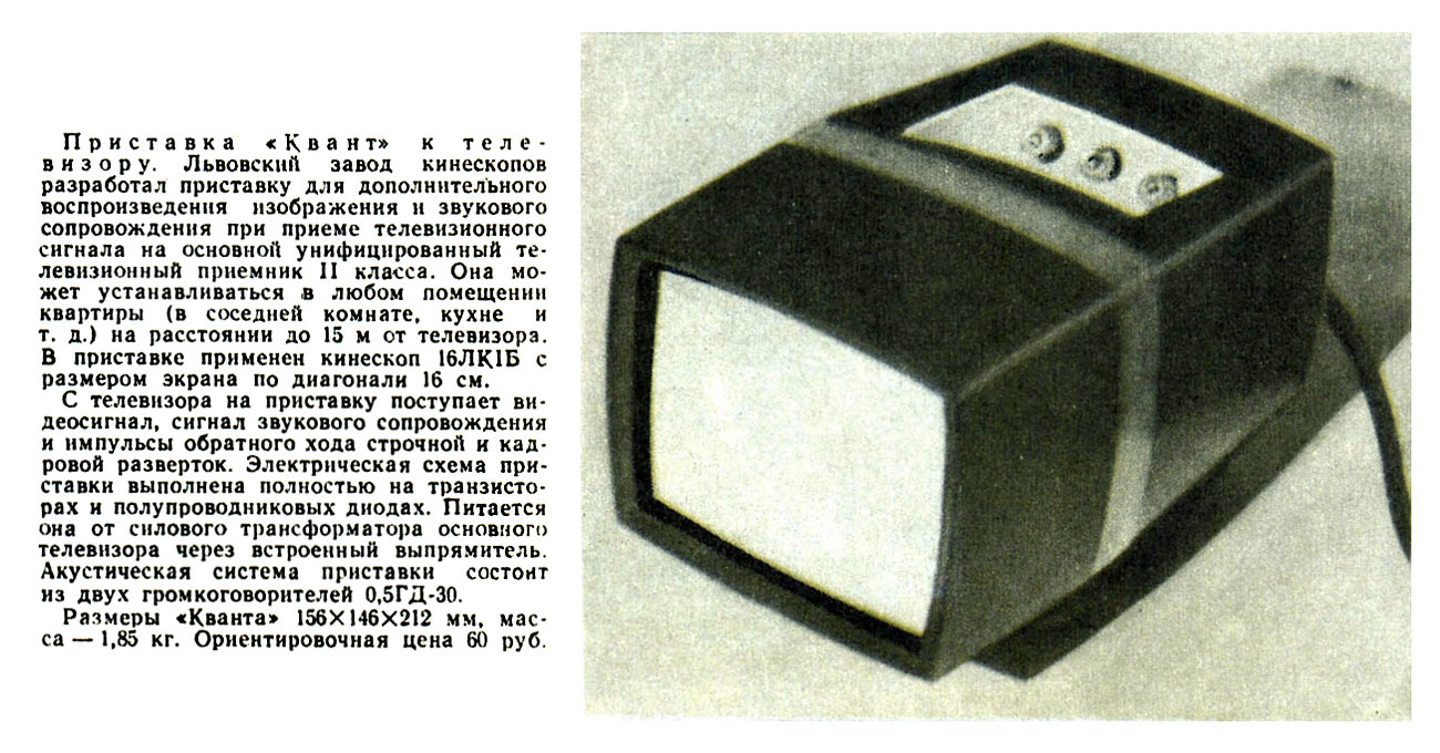 Масса 3,85 кг. Цена телевизионной приставки 60 рублей.